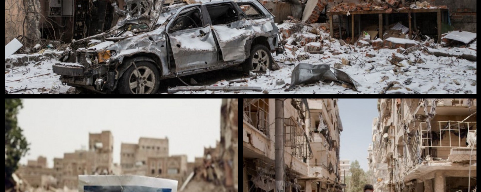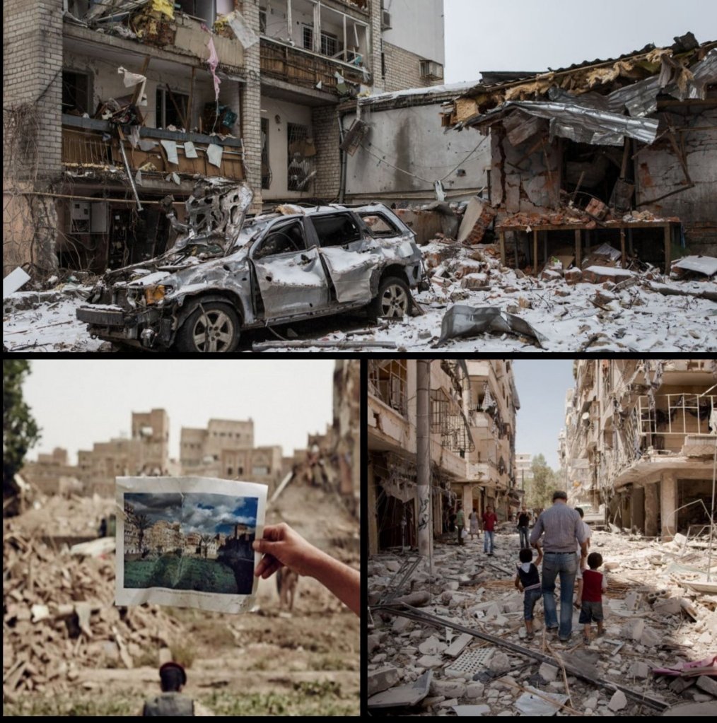 *Immagini delle devastazioni dei bombardamenti in Ucraina, Yemen e Siria.