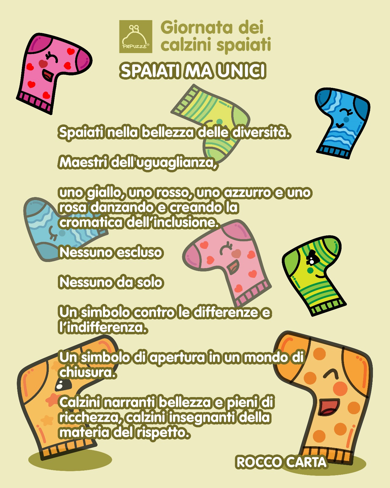 Oggi 6 febbraio è la giornata dei calzini spaiati.I calzini spaiati rappresentano la diversità in tutte le sue forme e questa giornata nasce con l’intento di sensibilizzare bambini, ragazze e ragazzi e adulti, ad accettare e rispettare l’altro.I disegni del … Continua a leggere Spaiati ma unici