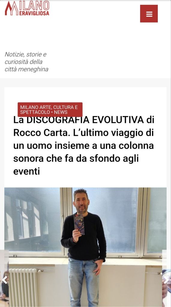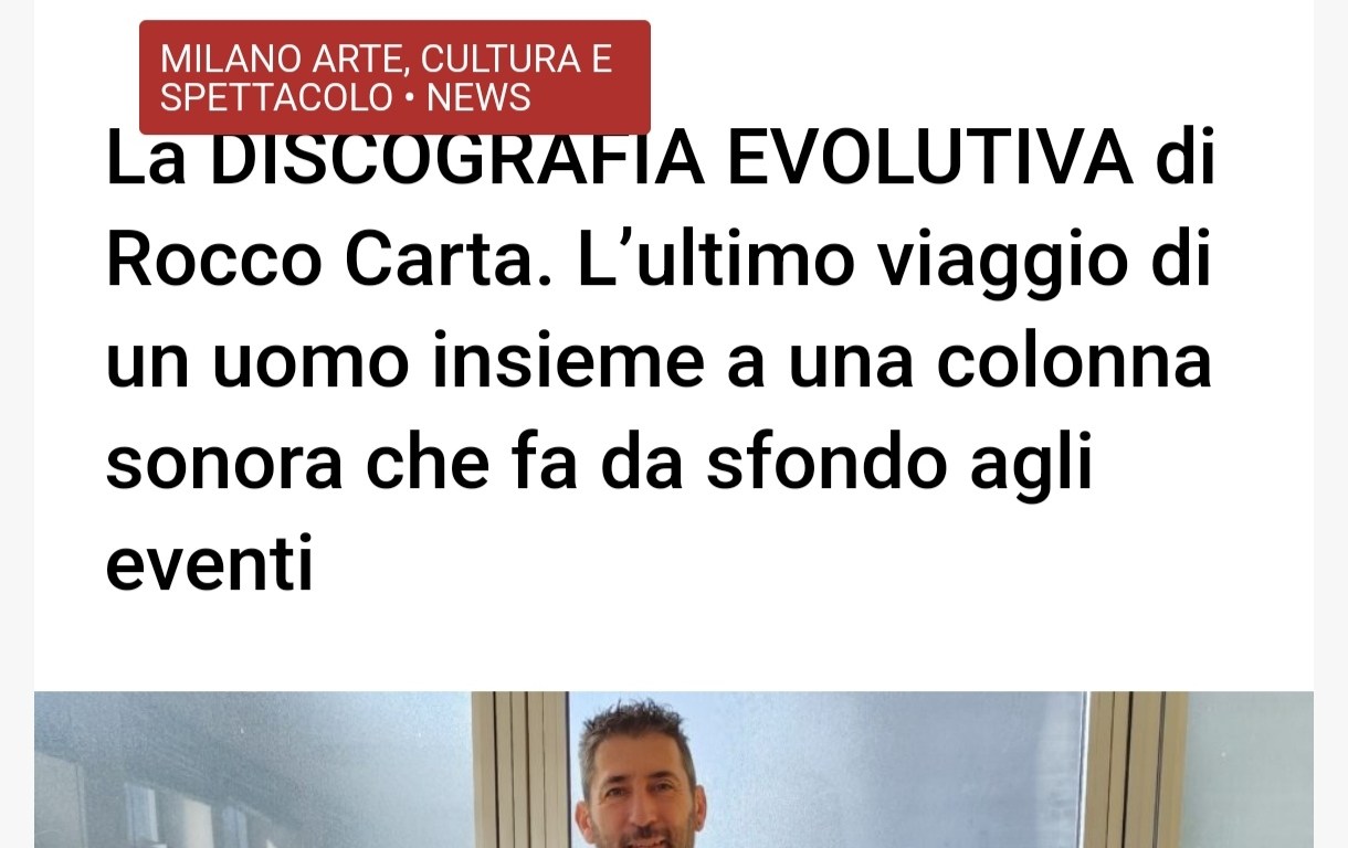 blog, i miei racconti La DISCOGRAFIA EVOLUTIVA di Rocco Carta. L’ultimo viaggio di un uomo insieme a una colonna sonora che fa da sfondo agli eventi – “Milano Meravigliosa” Articolo di Ermanno Accardi da “Milano Meravigliosa” su “Discografia Evolutiva” https://www.milanomeravigliosa.it/la-discografia-evolutiva-di-rocco-carta-lultimo-viaggio-di-un-uomo-insieme-a-una-colonna-sonora-che-fa-da-sfondo-agli-eventi/ Condividi: Fai clic per condividere su X (Si apre in una nuova finestra) X Fai clic per condividere su Facebook (Si apre in una nuova finestra) Facebook Mi piace Caricamento...