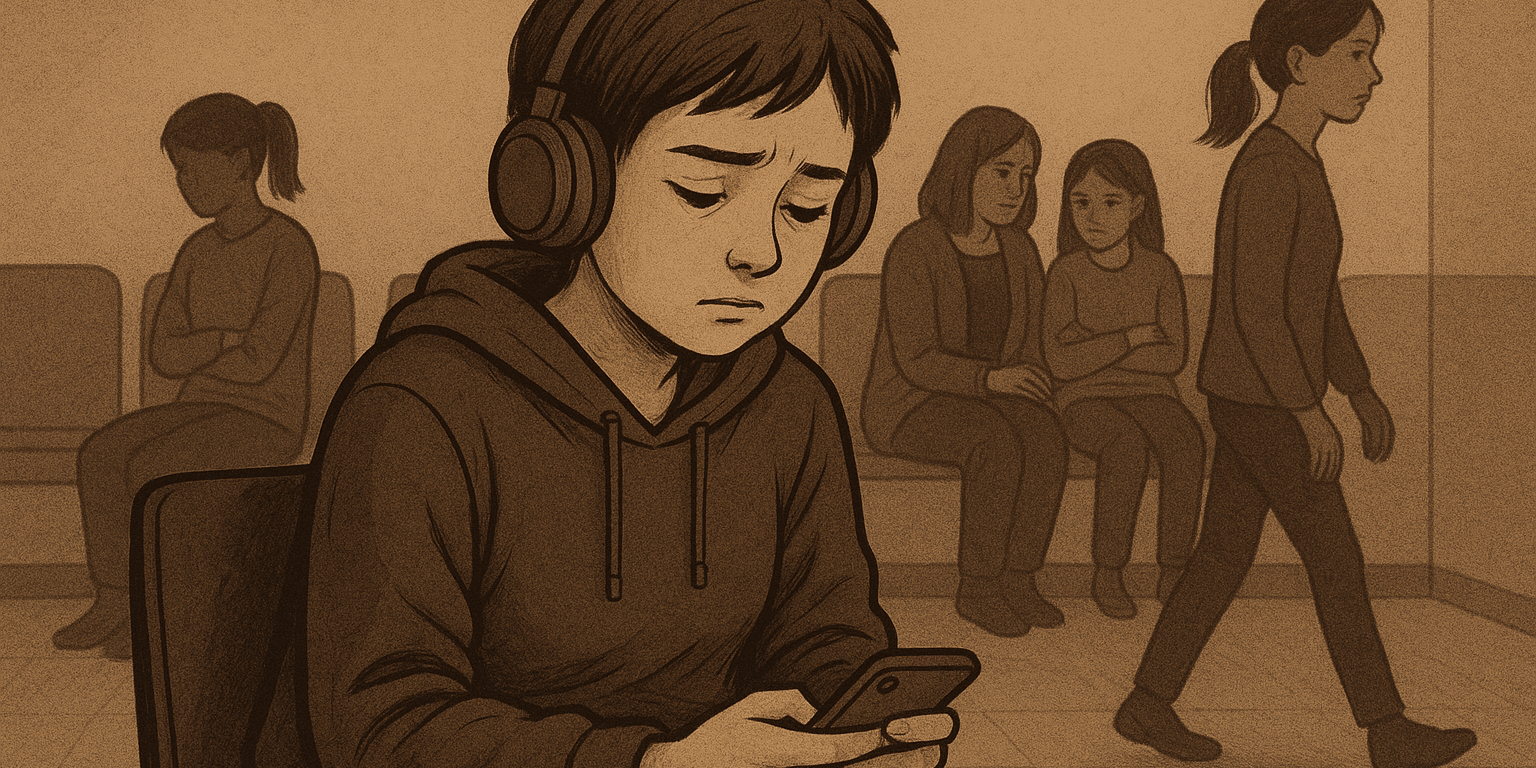 Un’adolescente inquieta è seduta poco distante: le cuffie, troppo grandi per il suo viso minuto, coprono il mondo fuori. Gli occhi, incollati al cellulare, sembrano cercare rifugio in uno schermo che non restituisce calore.