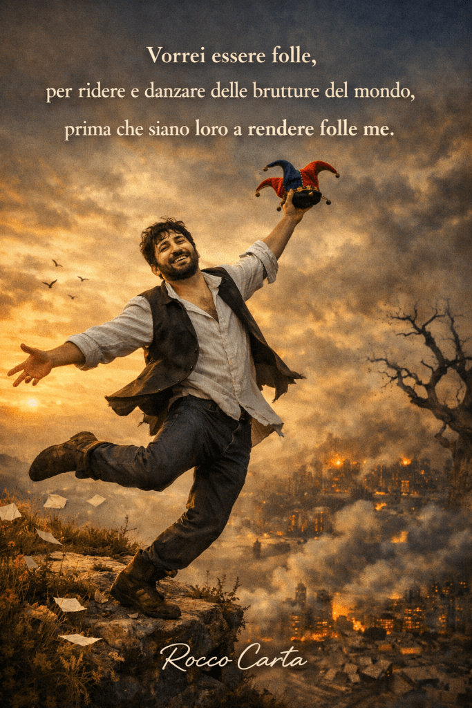 blog, i miei racconti Folle Vorrei essere folle,per ridere e danzare delle brutture del mondo,prima che siano loro a rendere folle me. Rocco Carta Condividi: Condividi su X (Si apre in una nuova finestra) X Condividi su Facebook (Si apre in una nuova finestra) Facebook Mi piace Caricamento...
